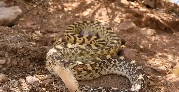 The Sonoran gopher snake has stunning coloring, with patches of yellow and brown as well as stripes on its tail.